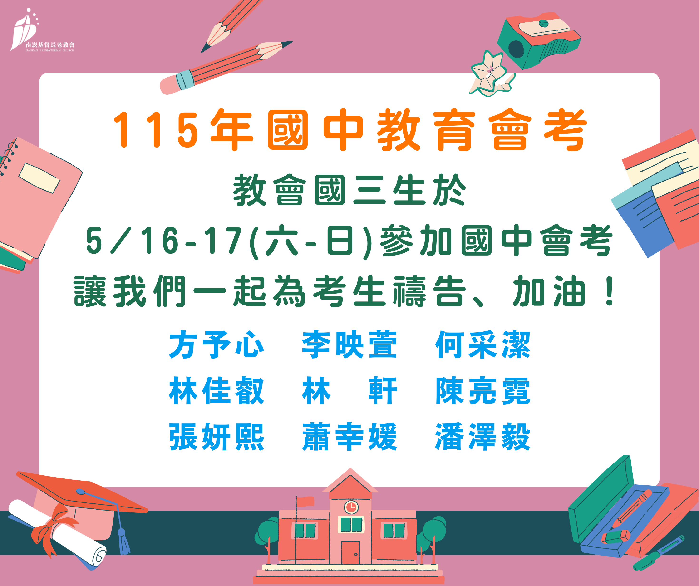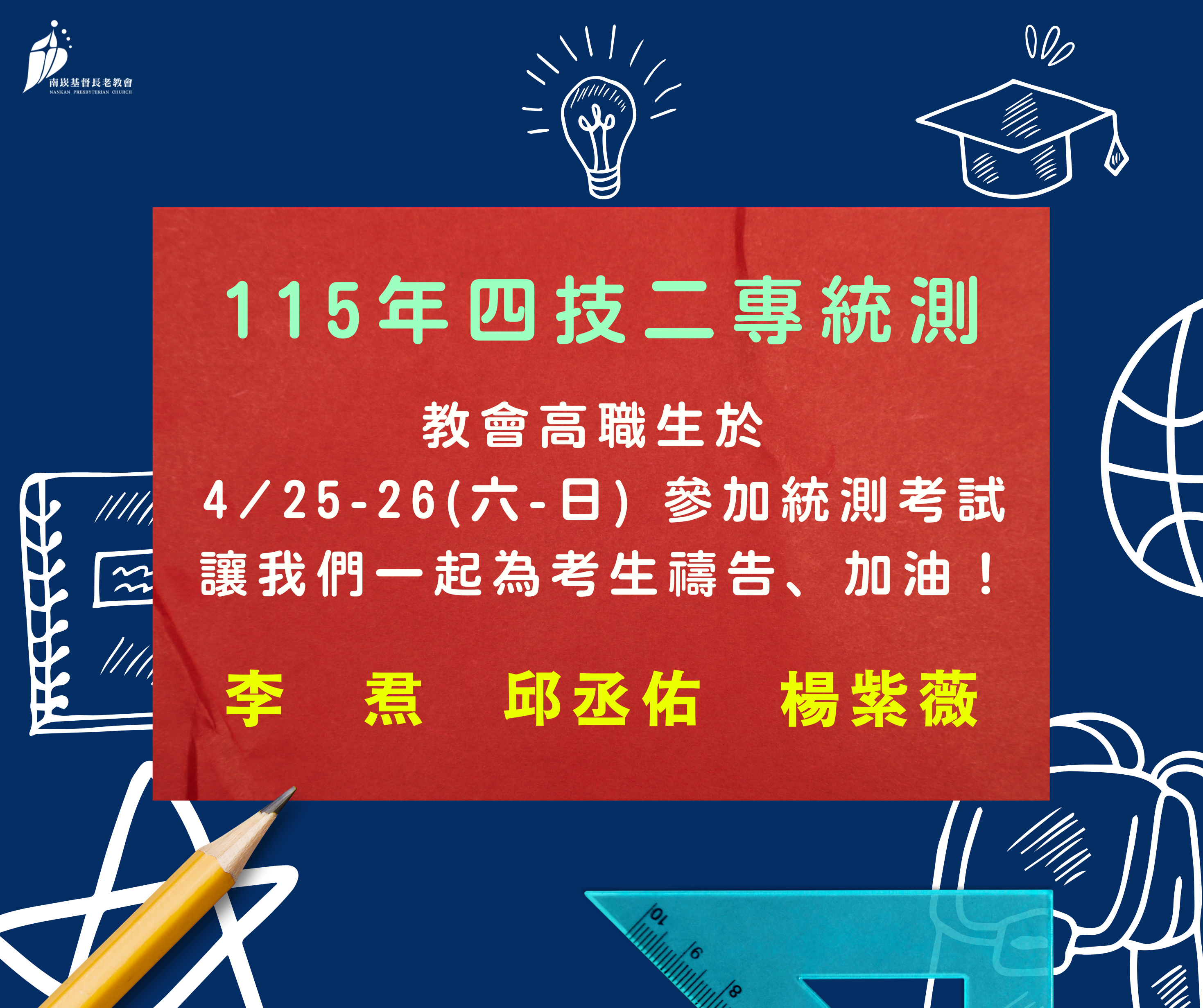 115學年度「四技二專統一測驗、國中教育會考」將分別於 4/25-26(六-日)、5/16-17(六-日) 舉行,讓我們同心為教會中的考生們代禱(名單如圖),將他們交託在主的手中。願主親自賜下從天而來的智慧與力量,使他們在預備的過程中有穩定的心、在考試當下有平安與專注,不被緊張與壓力影響。