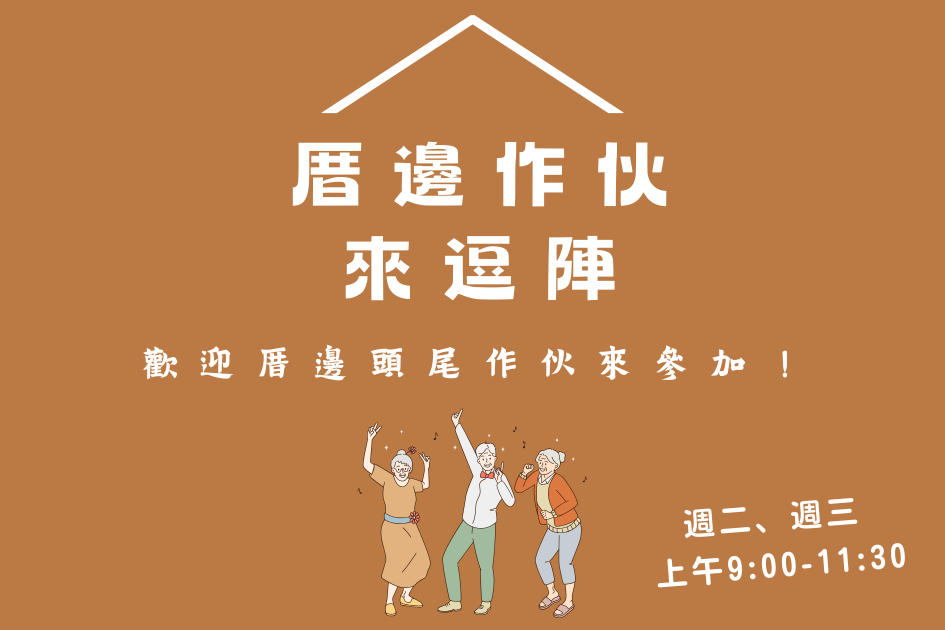 《厝邊作伙來逗陣》(簡稱「來逗陣」),盼望成為社區長輩彼此陪伴、分享生活的溫暖空間。聚會時間為週二、三 上午9:00–11:30,透過輕鬆多元的活動,一起聊天、歡笑、動一動!歡迎樂齡長輩逗陣來參加。