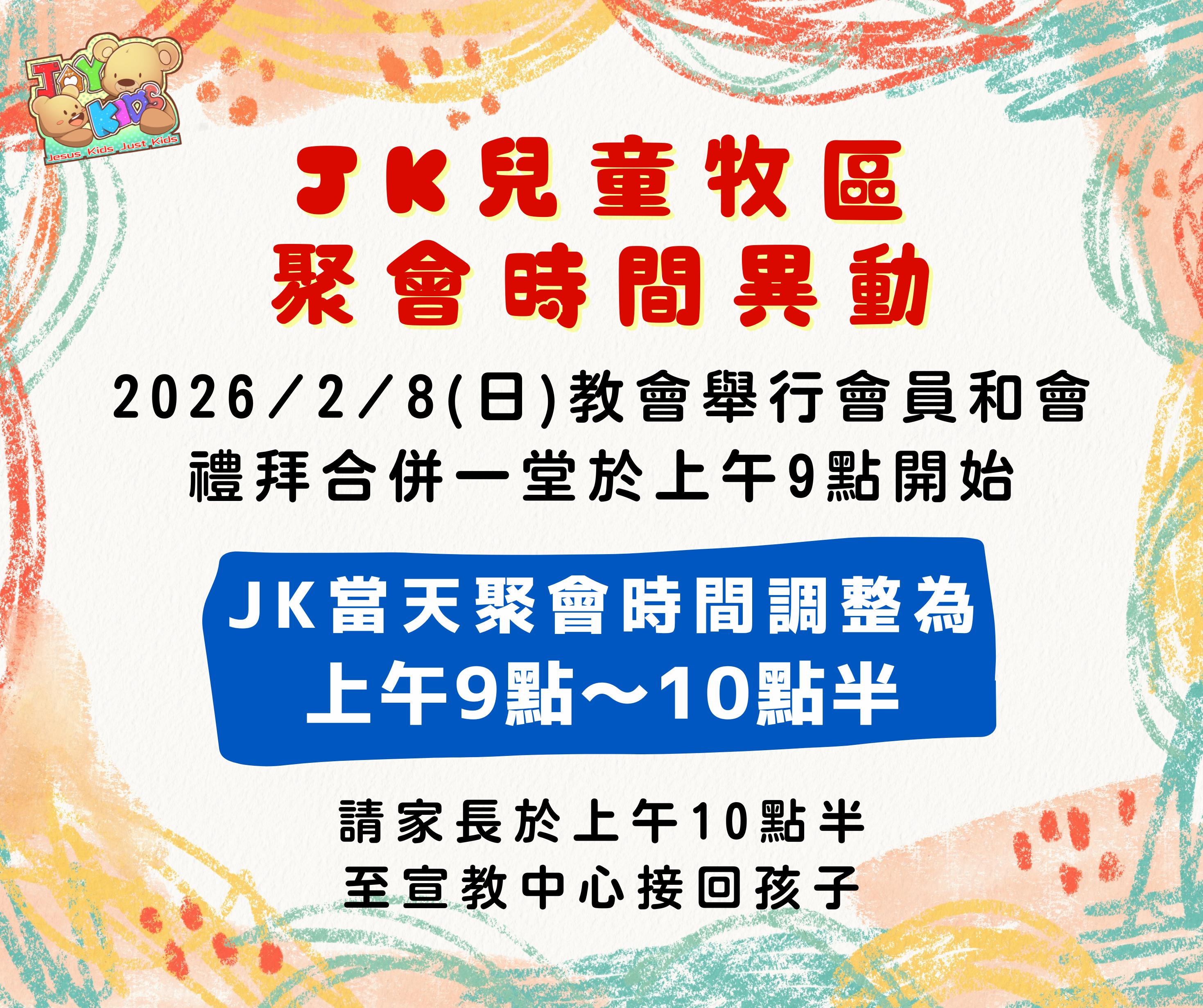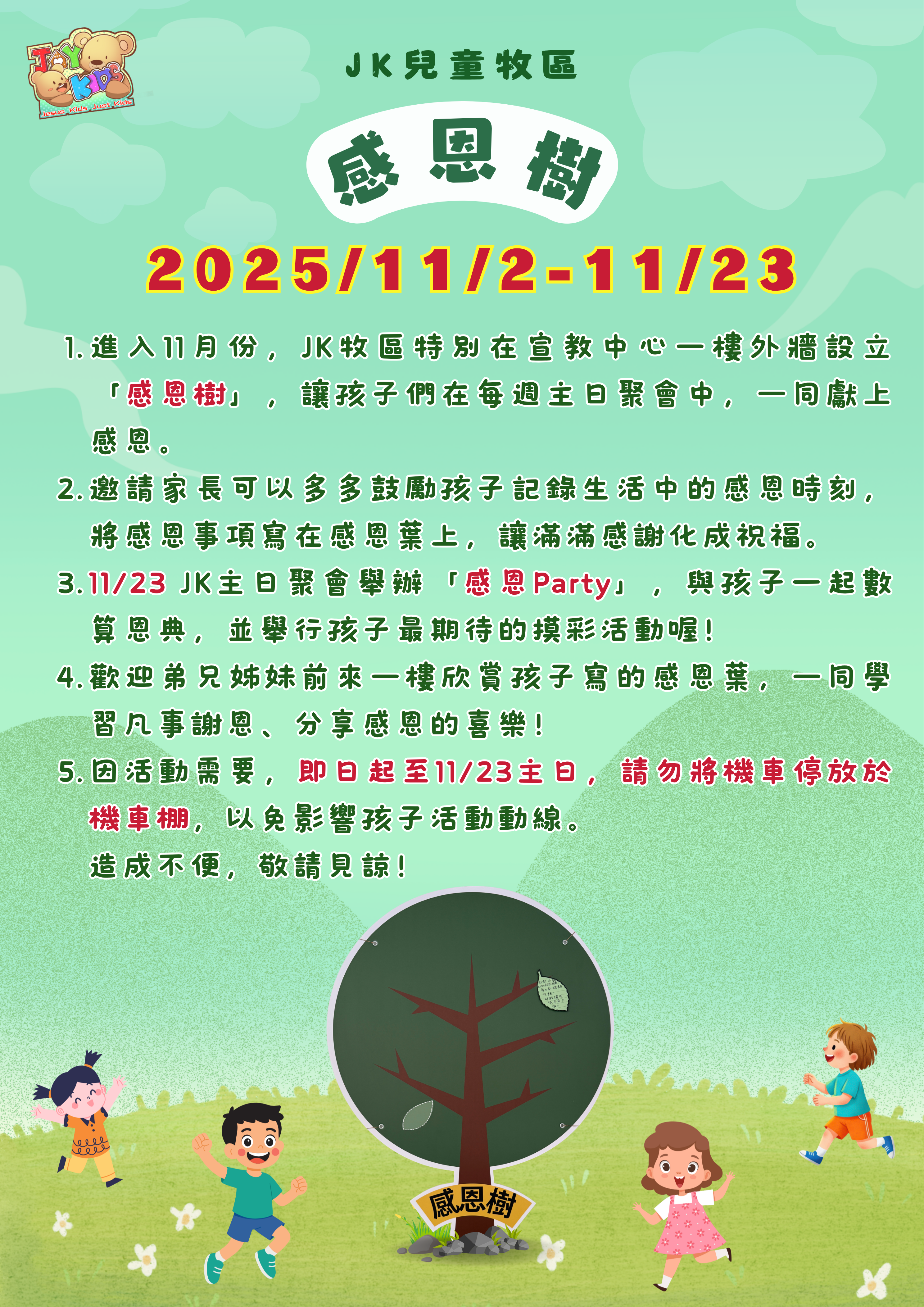 在每週主日的JK聚會中,不論是敬拜、破冰活動設計、課程準備、行政事務等等,JK老師與同工付出時間、心力來用心預備,為的就是提供給孩子最好、最適合的聚會環境,正也因為每週聚會都需要用心準備,我們需要更多對兒童事工有負擔的同工來加入我們!透過這些聚會的環節,在孩子身上撒下福音的種子,不僅要為孩子在從小建立堅實的信仰基礎,更期待孩子在成長中,與神與人建立美好的關係,活出天國子民的樣式。