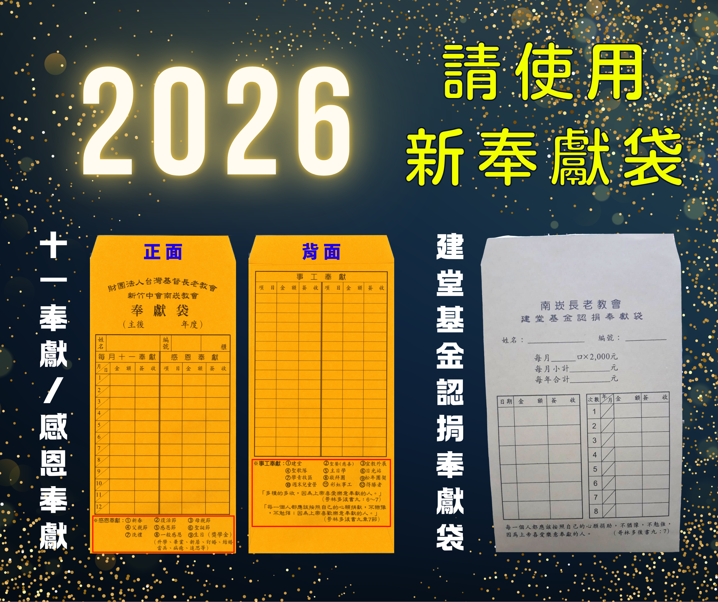 ❶ 2025年度起請使用新的奉獻袋作各項奉獻,鼓勵每位信徒參與「月定什一奉獻」及各項奉獻來回應上帝的愛及建造教會。