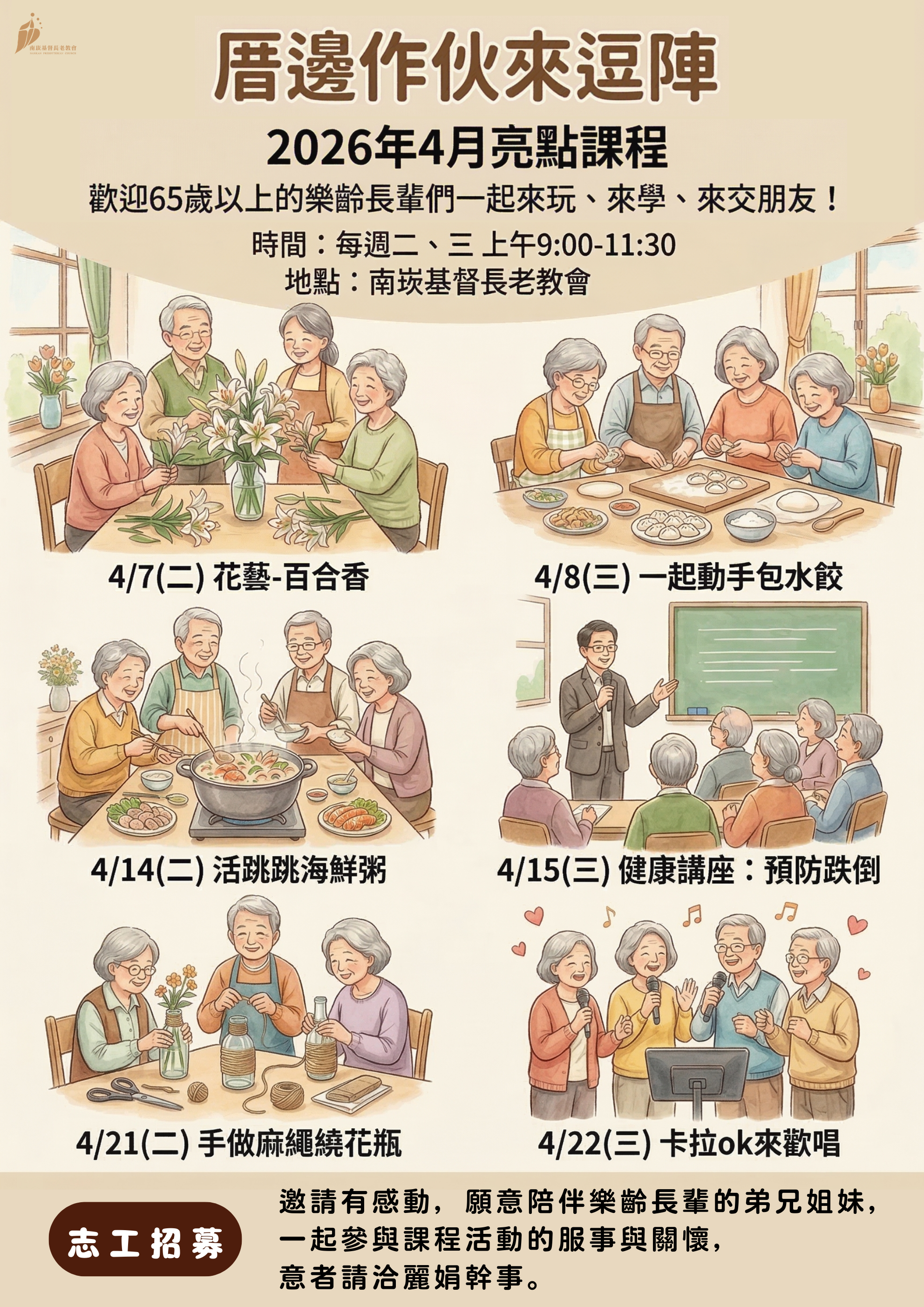 ※ 誠摯邀請願意以愛心陪伴並服事樂齡長輩的弟兄姊妹,一同參與課程活動當日的服事與關懷,詳情請洽麗娟幹事。