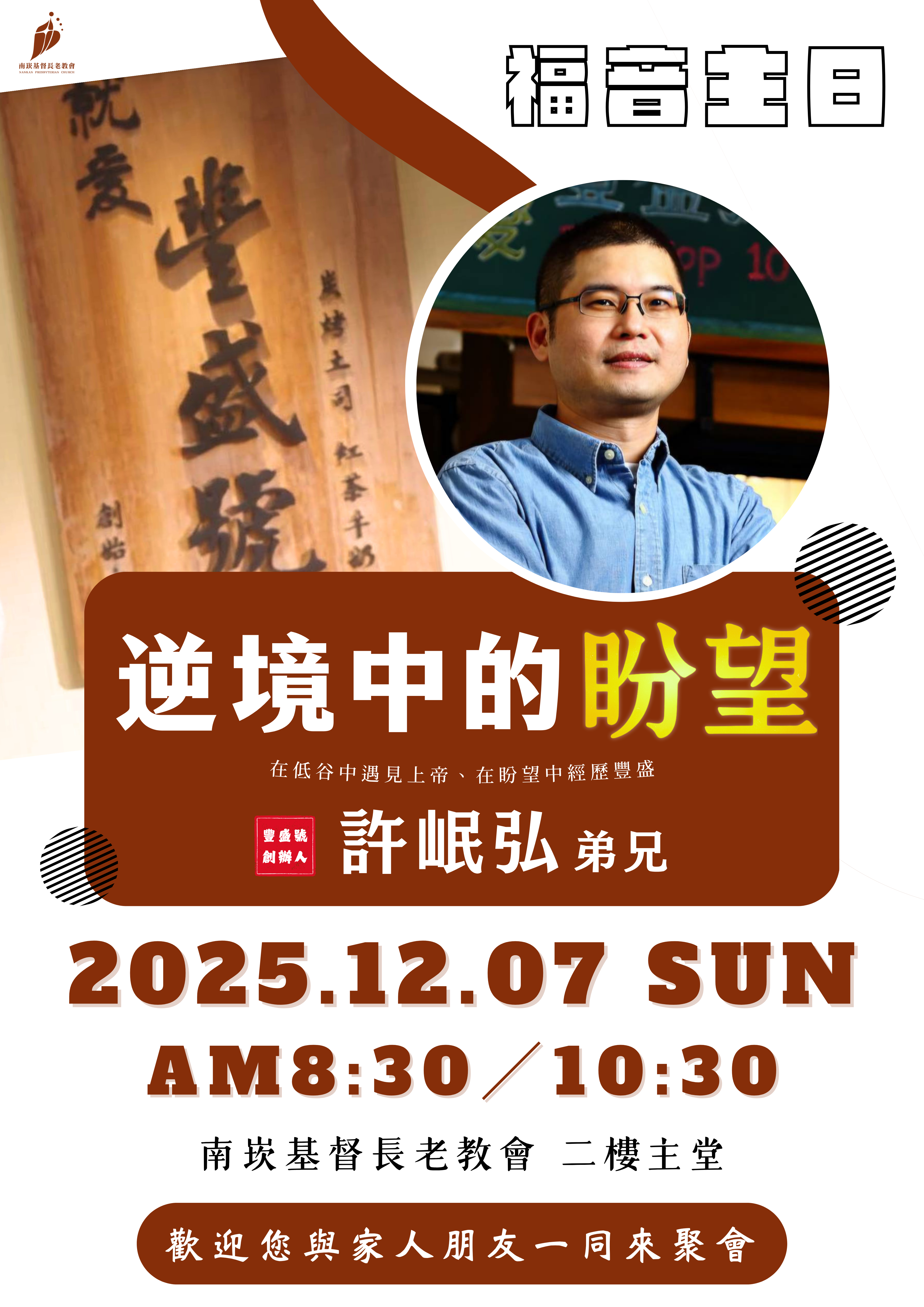 12/7(日) 是福音主日,教會特別邀請到「豐盛號」創辦人—許岷弘弟兄前來分享見證。
