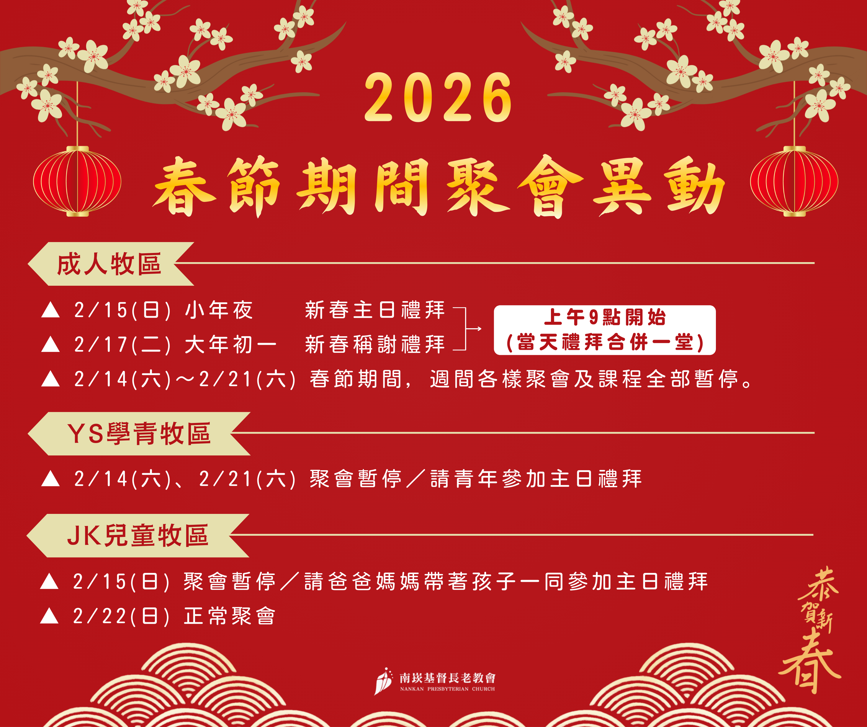 2026新春假期 ║ 主日禮拜及聚會時間異動