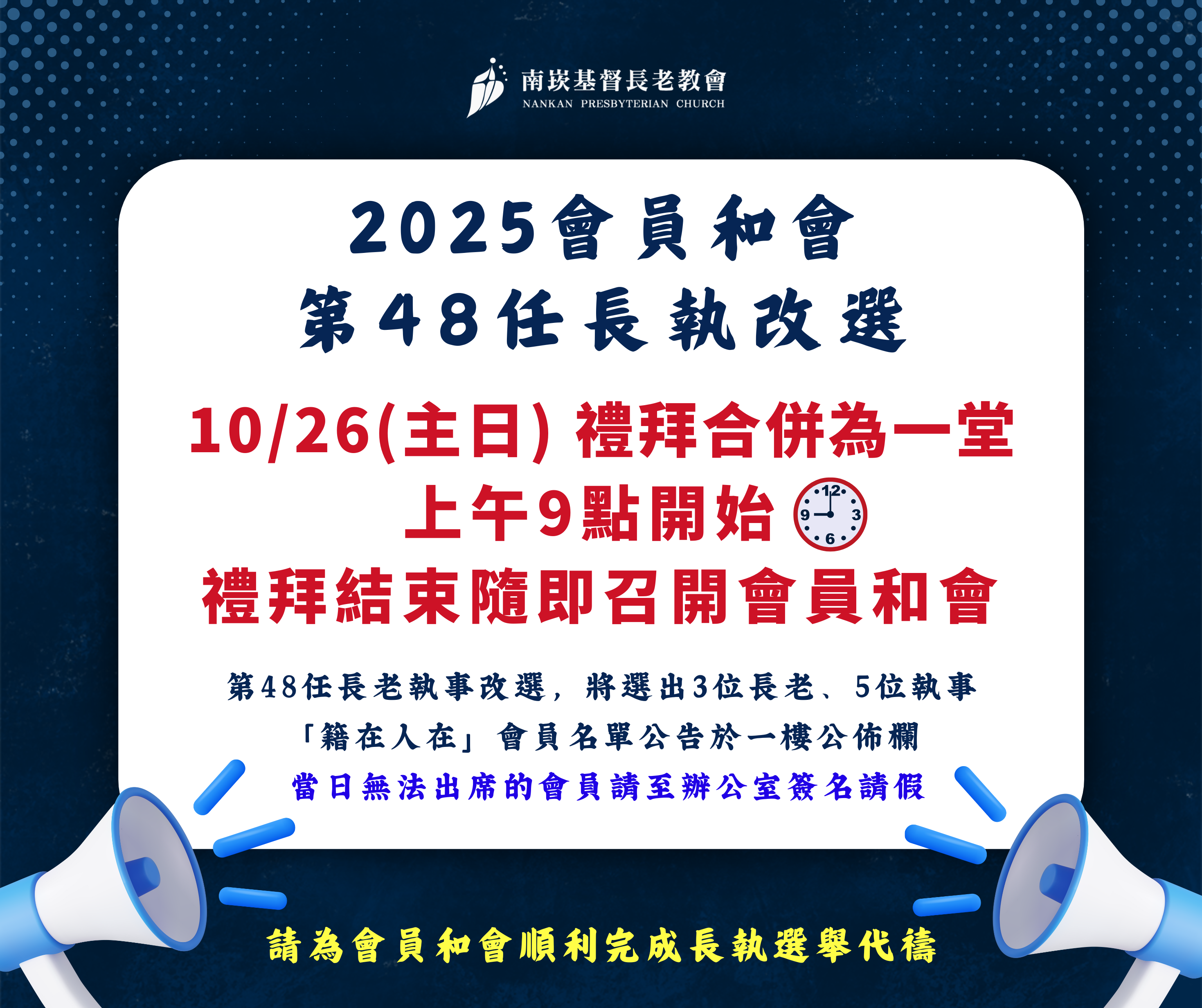 本會訂於 10/26(日) 主日禮拜後召開會員和會,改選第 48 任長老、執事,將選出 3 位長老及 5 位執事。